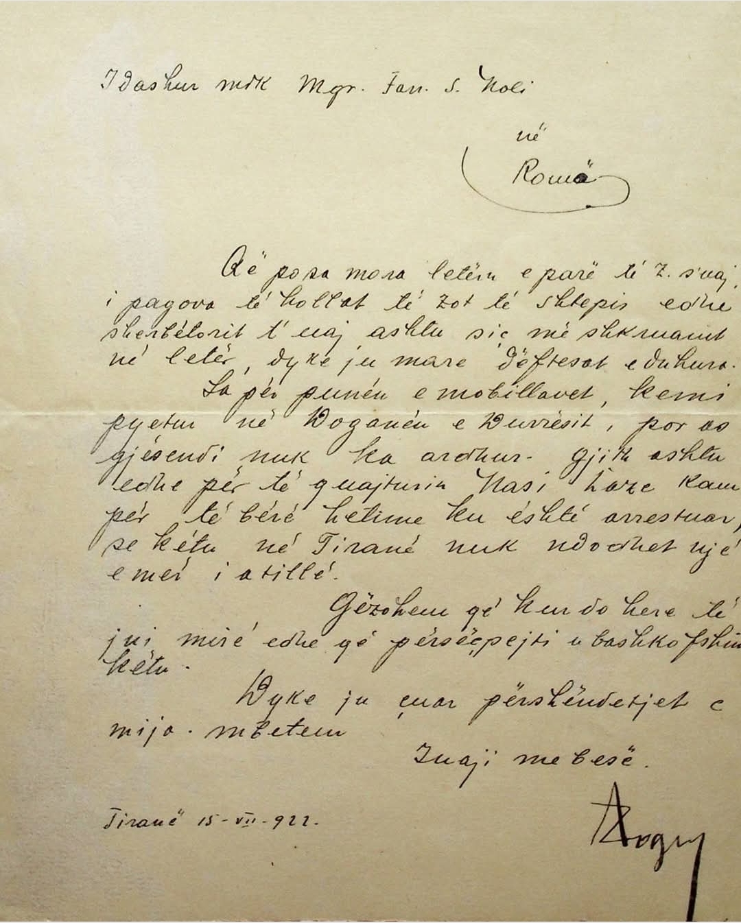 Në verën e atij viti, kur ndodhej në Romë, Noli i la Zogut disa porosi private dhe ky ia kreu, siç del nga kjo letër e shkruar bukur dhe me mjaft mirësjellje një shekull e ca më parë: