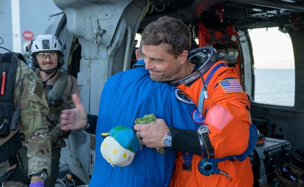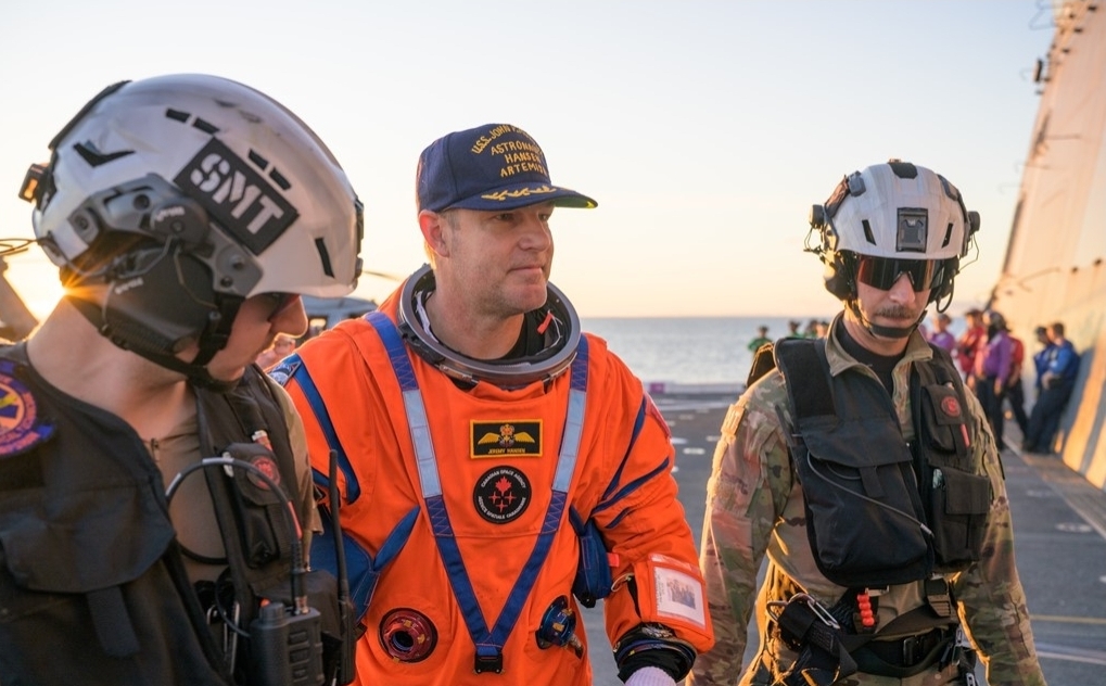 Fotografitë tregojnë katër anëtarët e ekuipazhit Artemis II duke buzëqeshur dhe duke përshëndetur me gishtin e madh lart ndërsa mbërrijnë në anijen e rimëkëmbjes së Marinës Amerikane, John P Murtha.
