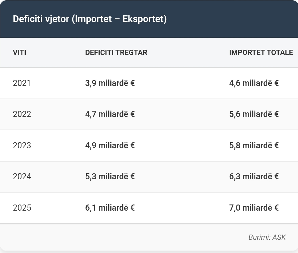 Kjo shpërputhje ushqehet nga dy trende të kundërta. Ndërsa importet kanë ndjekur një rritje të pandalshme – nga 5.6 miliardë në 2022 duke kapur kulmin historik prej 7.0 miliardë eurosh në 2025 – eksportet kanë bërë hapa prapa.