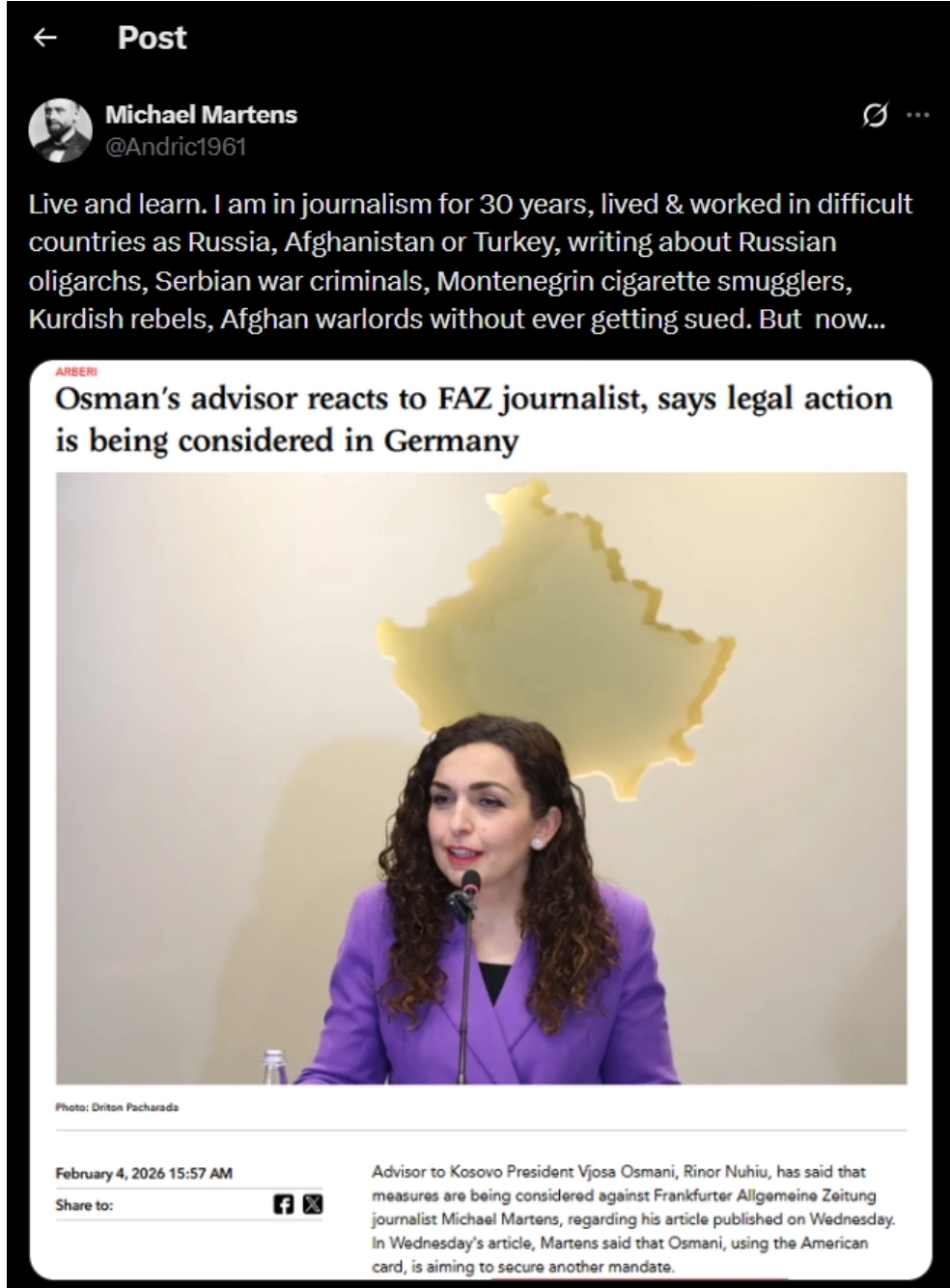 Michael Martens, redaktori i Frankfurter Algemeine Zeitung ka reaguar pas paralajmërimit për padi nga Presidenca e Kosovës në lidhje me shkrimin e tij të botuar në FAZ, ku shkruante se si Vjosa Osmani po e luante “kartën e kandidates së Trump” për t’u bërë presion ligjvënësve kosovarë për ta rizgjedhur.