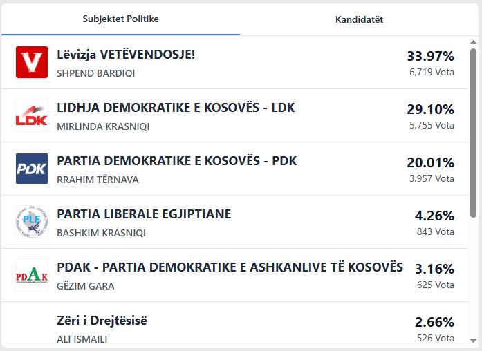 Sipas rezultateve preliminare të Komisionit Qendror të Zgjedhjeve për zgjedhjet e 12 tetorit 2025, Lëvizja Vetëvendosje prin në këtë komunë me 33.97 për qind të votave, ndërsa LDK renditet e dyta me 29.10 për qind. Në vendin e tretë pozicionohet PDK me 20.01 për qind.