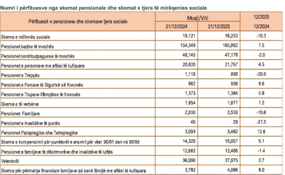 “Në muajin dhjetor 2025, krahasuar me muajin dhjetor 2024, kishte rënie të numrit të përfituesve nga: skema për pensionet invalidore (-27,5 %); skema për pensionet e Trepçës (-20,6 %); skema për pensionet familjare (-10,6 %); skema e ndihmës sociale (-10,3 %); skema e pensioneve kontribut- paguesve të moshës (-2,0 %); skema për familjet e dëshmorëve dhe invalidët e luftës (-1,4 %)”, thuhet në njoftimin e ASK-së.
