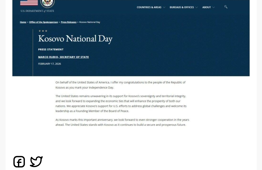 Kështu tha Kryediplomati i ShBA-së, Marco Rubio, në një urim për 18 vjetorin e Pavarësisë së Kosovës.
