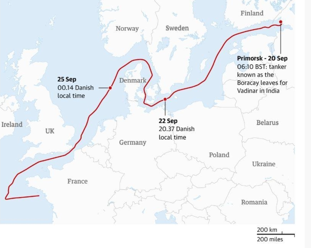 “Boracay”, anija transportuese me flamur të Beninit, porsa e kishte ndryshuar emrin nga “Pushpa”. Nën këtë emër, anija ishte vëzhguar duke lundruar drejt perëndimit afër Danimarkës javën e kaluar dhe ishte përmendur nga ekspertët detarë si njëra nga anijet e lidhura me Rusinë që mund të jetë përfshirë në incidentet me dronë.