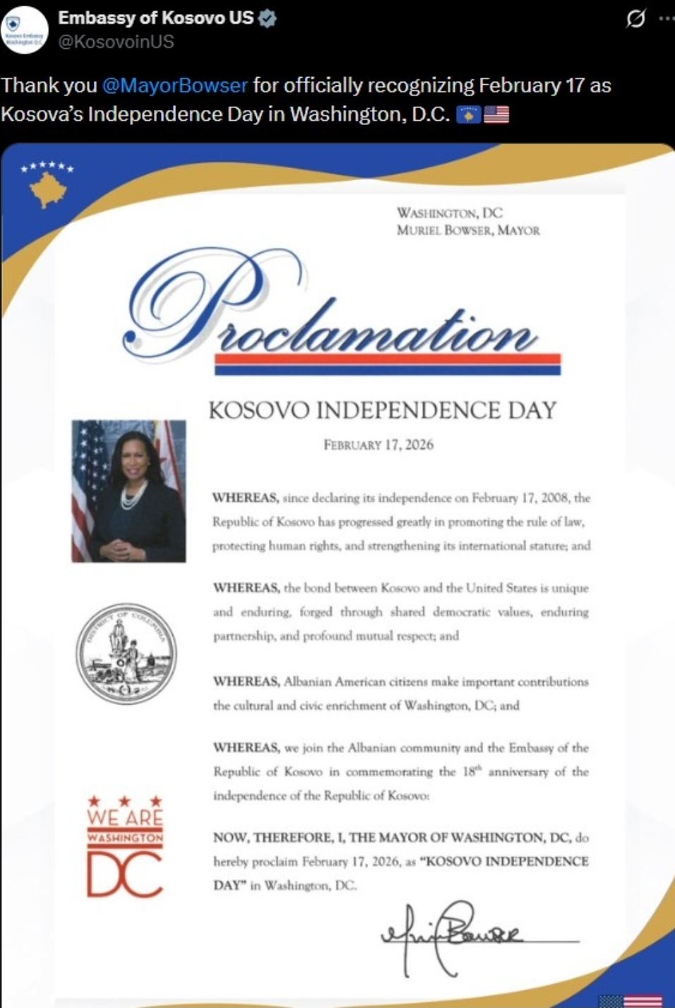 “Faleminderit kryetarja Bowser që njohët zyrtarisht 17 shkurtin si Ditën e Pavarësisë së Kosovës në Uashington, D.C.”, thuhet në reagimin e Ambasadës.