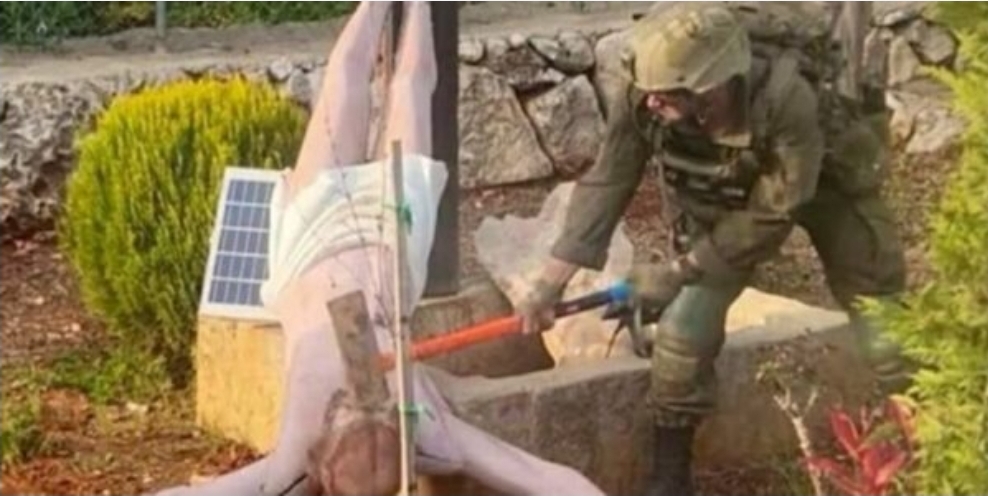 Një imazh i një ushtari izraelit që duket duke goditur një statujë të Jezusit me një çekiç në Libanin jugor ka shkaktuar dënim të gjerë pasi është shpërndarë gjerësisht në internet.
